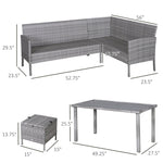 Five-Piece Patio Furniture Set: Our patio furniture set features two loveseats that combine together to make a large L-shaped sectional sofa, two stools that double as ottomans, and a faux wood dining table.